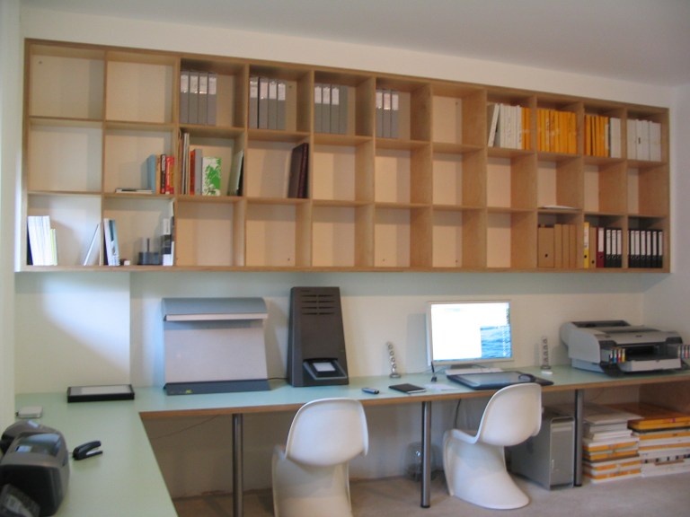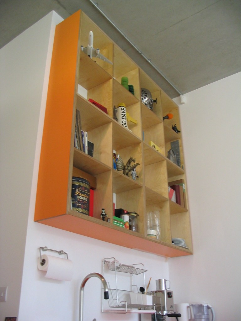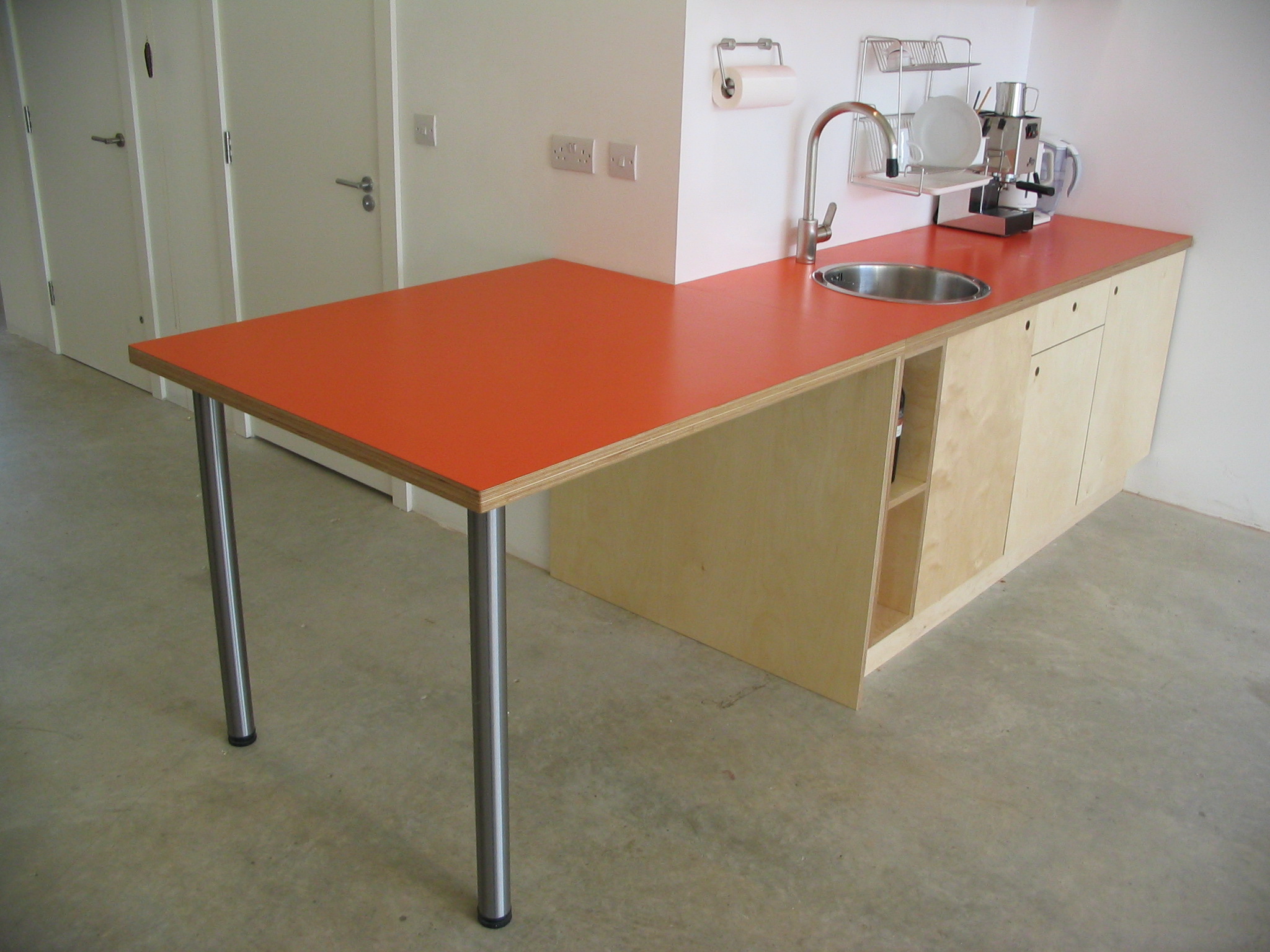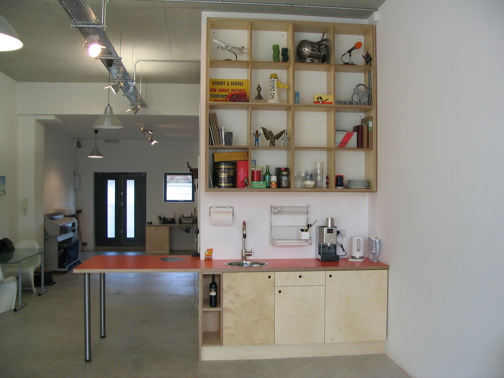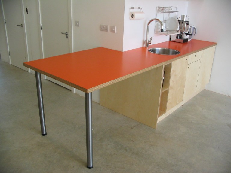 This design for this project involved working in close collaboration with the client. The vision was to create a versatile studio that was both functional and fun. The studio incorporates a work/office space, a kitchenette/ dining area, with a display unit above. It is made entirely from birch plywood with coloured laminate surfaces.