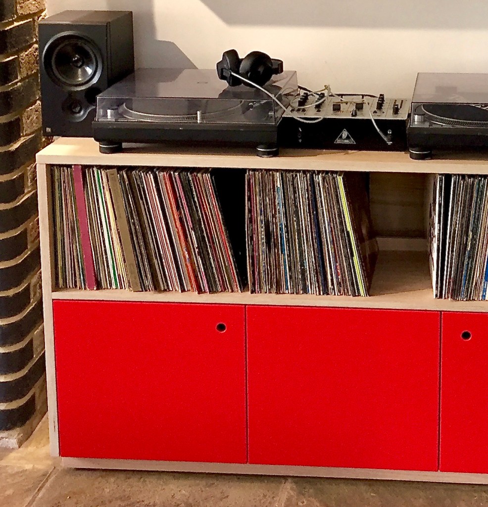 Freestanding Hi fi cabinet with shelving above. Made from oak faced birch ply, oiled finish with scarlet doors, eggshell spray finish.